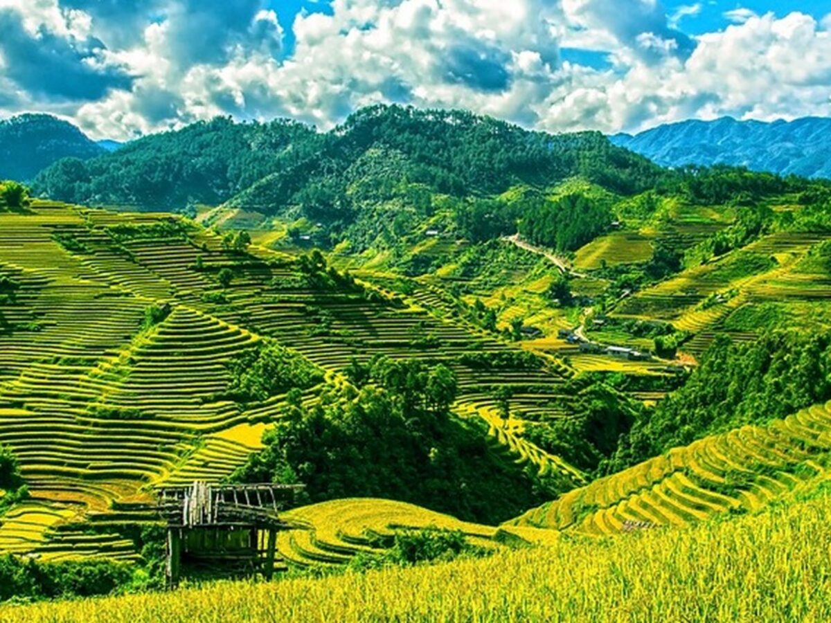 Nestled in the mountains of Yên Bái Province, Mù Cang Chải is famed for its spectacular terraced rice fields, carved over centuries by the H’mong people. These terraces transform with the seasons—glistening like mirrors in May and June, then glowing gold during the September–October harvest.
