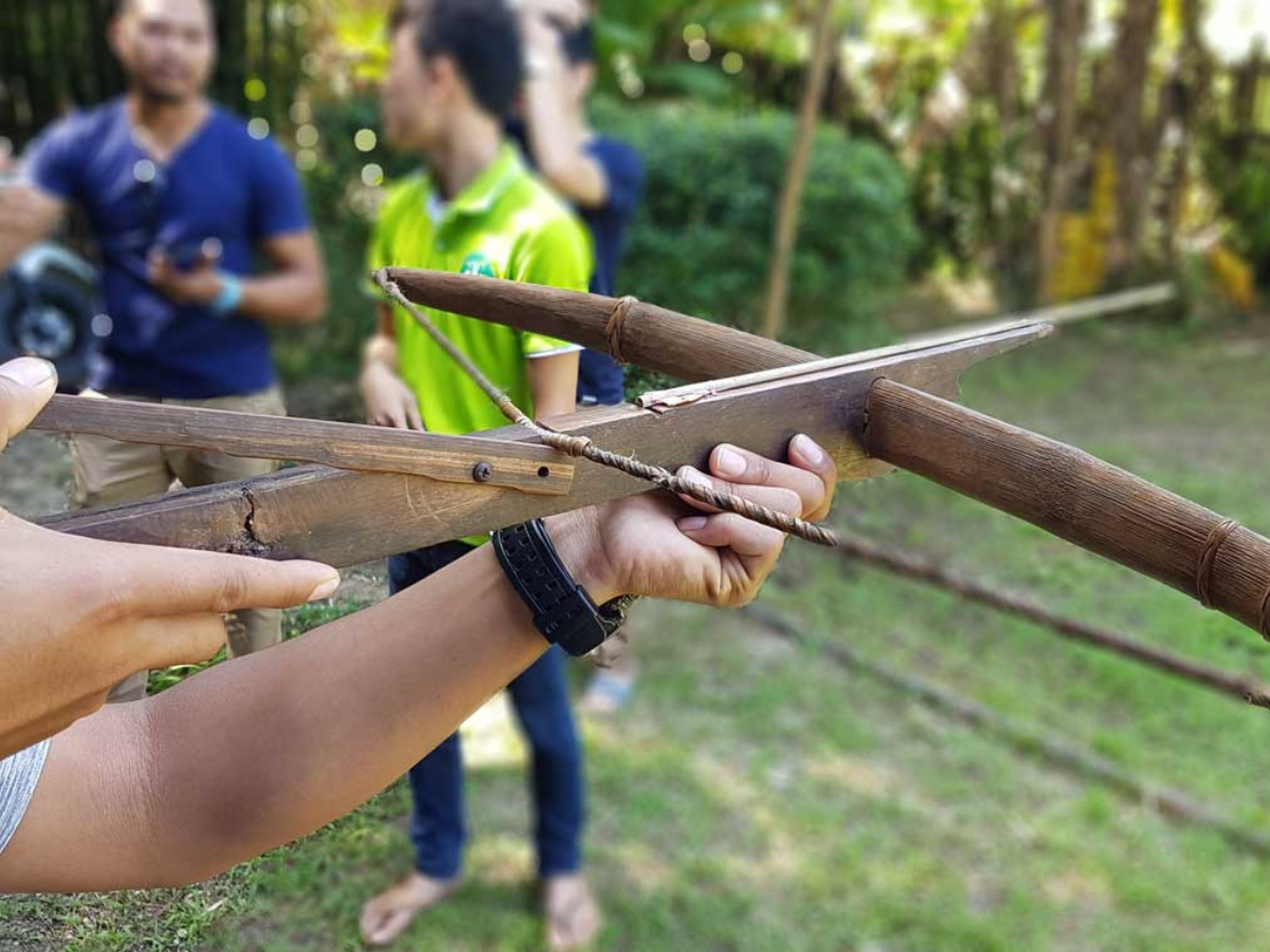 We will take you to a rustic pavilion modeled on a traditional Lao house, perched in a picturesque setting next to rice fields. You will listen to an entertaining introduction to the importance of bamboo to Lao culture and the use of bamboo in a diverse range of household items found in rural Lao dwellings. Try your skills at crossbow shooting and walking on bamboo stilts! Give pounding sticky rice a go with a traditional Pestle & Mortar. You’ll weave a souvenir bamboo mat and enjoy a fun, interactive cooking class, using the bamboo plant as the key ingredient. After enjoying your lunch, listen to the Hmong Khen “bamboo instrument” performance and try playing it yourself before attempting the Kamu bamboo dancing “Skipping poles”