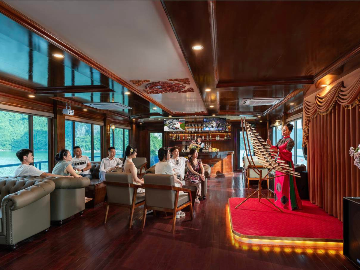 16:30: Returning to the ship for a Sunset Party, enjoying a Live Traditional Music Performance as the ship cruises back to Tuan Chau Harbor. You will have a great time chilling out with friends on the Upper deck with unforgettable moments.