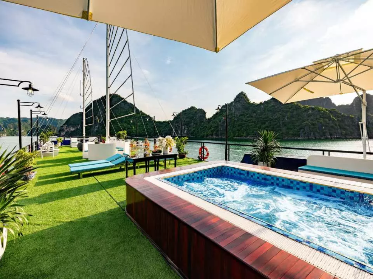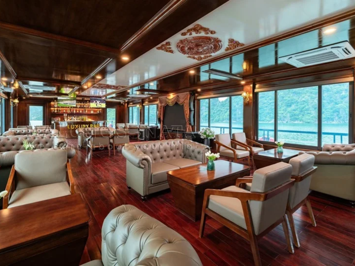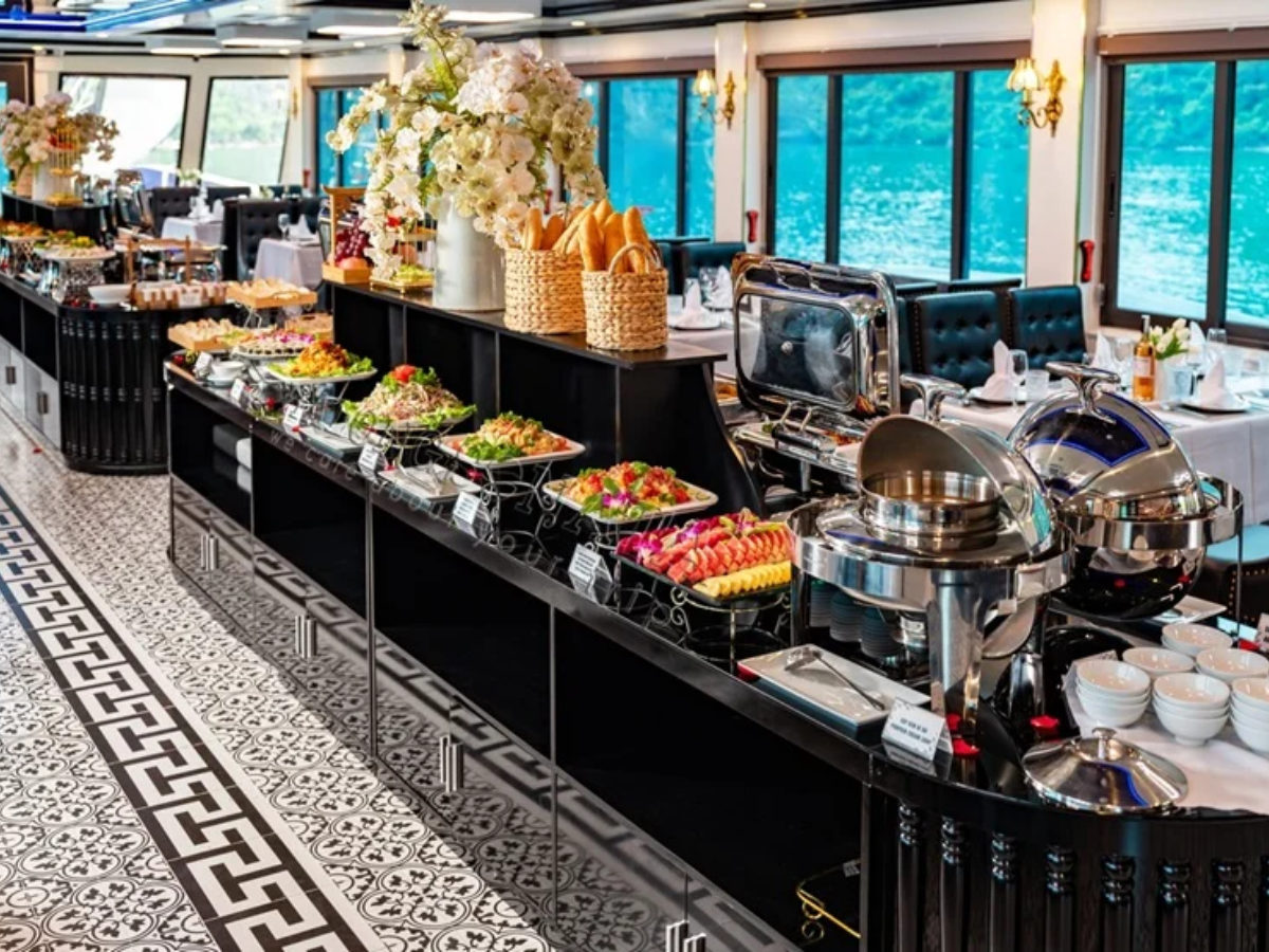 Halong Sonata Cruise, you begin your enchanting 5.5 to 6-hour journey through the scenic 2-day sleeper cruise route, renowned for its stunning, uninhabited islets and rock formations. A buffet-style lunch (or set menu, depending on the number of passengers) will be served on board.