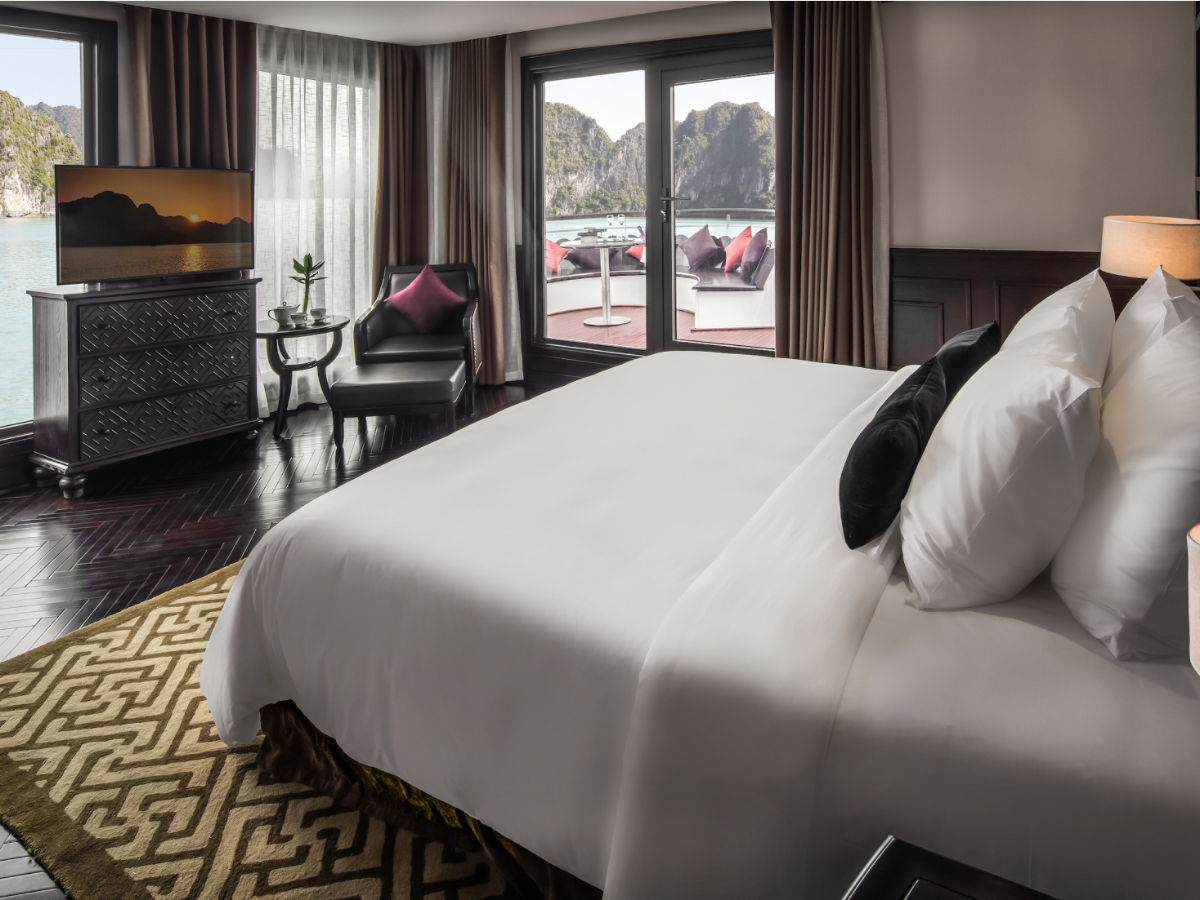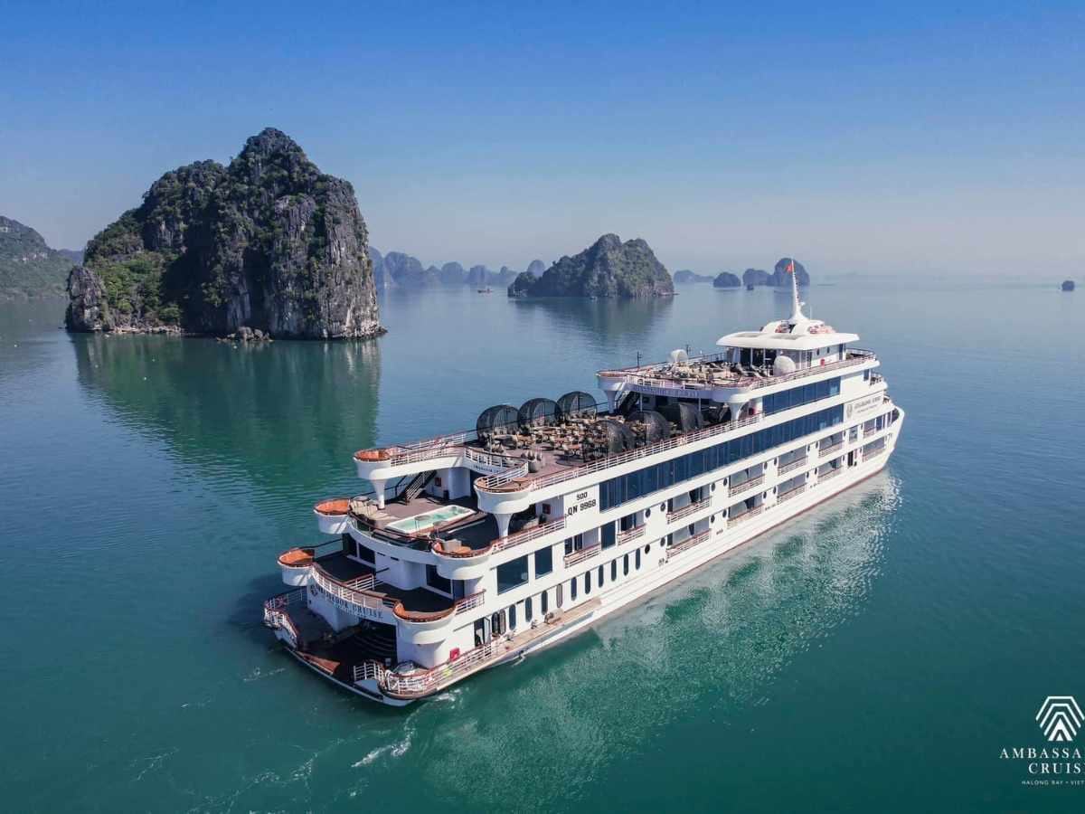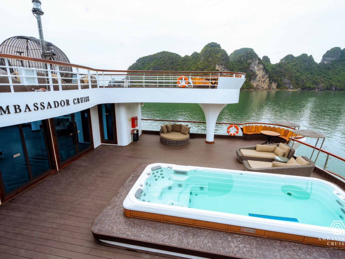 Ambassador Overnight Cruise stands as the most spacious luxury overnight cruise in Halong Bay, presenting 46 lavish cabins that come complete with personal balconies or terraces. Complemented by twin panoramic sundecks, an upscale dining venue, a melodious piano lounge, bars, an outdoor Jacuzzi pool, and a rejuvenating spa, the cruise assures a comprehensive experience.