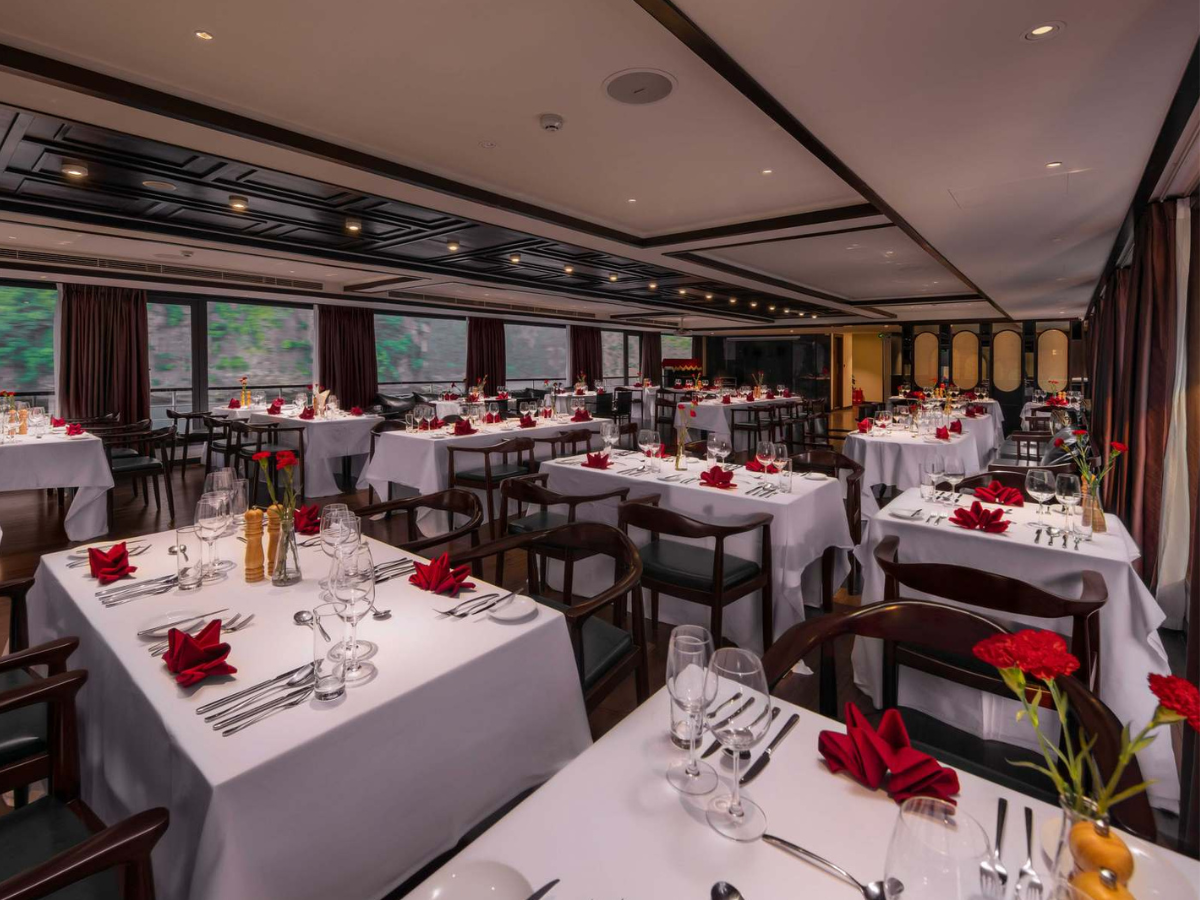 13:00: A splendid lunch is served at Tahiti Restaurant while the cruise travels across primitive Lan Ha Bay. The bay has hundreds of islands and islets, making it a wonderful background for guests to look at while dining.