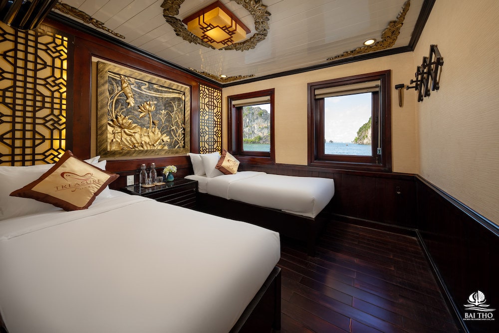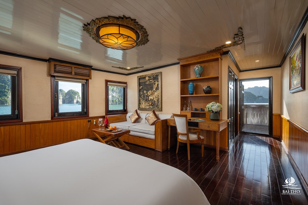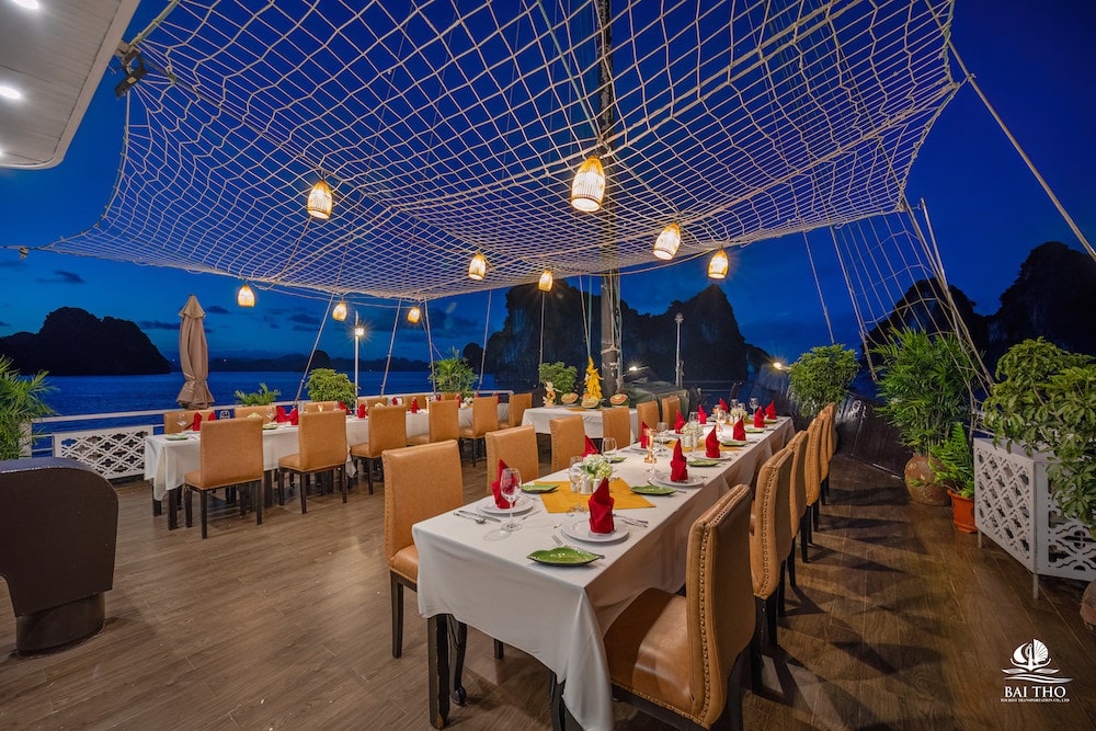 Savor lunch when the ship starts cruising to Bai Tu Long Bay. Stop at Cong Do Area for kayaking and exploring the pristine beauty of the bay. Back to the junk and admire the beautiful sunset from the top deck. Take part in a cooking demonstration or order some favorite drinks from the bar.